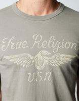 A classic crew neck tee in army green is highlighted by an eagle emblem on the front for a nod to time-honored, American military style. In order to encapsulate a signature vintage effect, a thorough handcrafted wash was applied. An added bonus is the superbly soft hand that comes with our natural distress process.